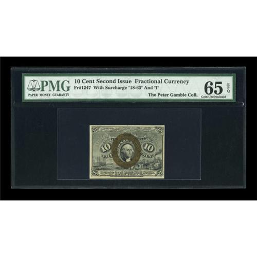 <B>Fr. 1247 10c Second Issue PMG Gem Uncirculated 65 EPQ.</B></I> This attractive "18-63" and "1" issue boasts margins sufficient of Gem and exceptionally bright paper for the issue.<BR><I>From The Peter Gamble Collection.</B></I><BR><BR><b>Shipping:</b> Coins & Currency (<a target="_blank" href="http://www.heritageauctions.com/common/shipping.php">view shipping information</a>)