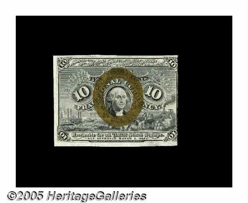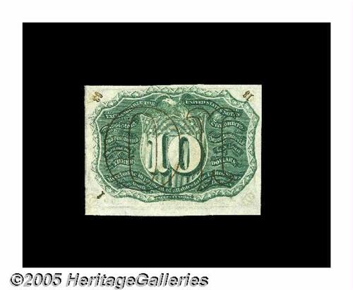 <B>Fr. 1247 Milton 2R10.4b 10¢ Second Issue Inverted Back Surcharge Very Choice New.</B></I> Fr. 1247 is a sleeper number even as an ordinary note, and it is extremely rare as an invert with only 2 pieces known. This note, which was the Friedberg Sale example, is a second low-grade damaged piece. Save for a close right face margin, this bright and flashy piece would be a perfect Gem. It realized $935 eight years ago.