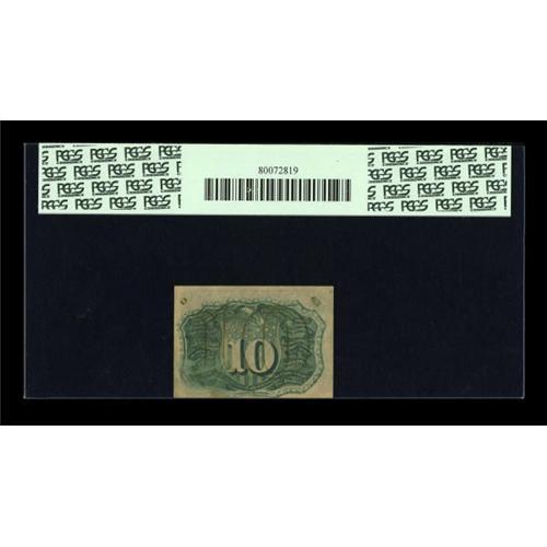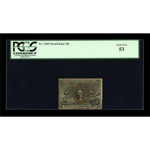 <B>Fr. 1248 10c Second Issue PCGS About New 53.</B></I> Only about two dozen examples of this number are known, and they always attract considerable attention when one appears at auction. This one, as is the case with most known pieces, is somewhat off-center: the face has two tight margins and the back design touches the edge at the bottom. The surcharges are in the normal, plain font. Milt Friedberg has traced the earliest appearance of an "O-63" note back to the Harlan P. Smith sale of the R.C. Davis Collection on January 20, 1890. Smith has long been suspected of "manufacturing" the Fr. 1310a's, and some suspicion must fall on him for the possibility of his also having created these Fr. 1248's. All but one of the known Fr. 1248's have this very plain "O-63" surcharge. The one exception has more ornate surcharges, and is likely the only Bureau-produced Fr. 1248. In any event, these notes have always been considered part of a Fractional set. This example has somewhat aged paper, but it is otherwise nice for the grade.<BR><I>From The Thomas M. Flynn Collection</B></I><BR><BR><b>Shipping:</b> Coins & Currency (<a target="_blank" href="http://www.heritageauctions.com/common/shipping.php">view shipping information</a>)