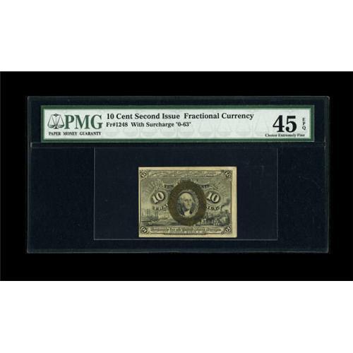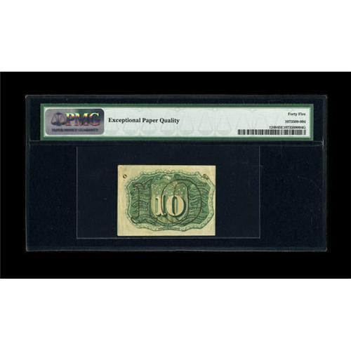 <B>Fr. 1248 10c Second Issue PMG Choice Extremely Fine 45 EPQ.</B></I> Relatively few examples of this Friedberg number are known, and they always attract considerable attention when one appears at auction. This one, as is the case with most known pieces, is somewhat off-center: the face has a tight margin at left and the back design touches the edge at the right. The colors of this note, are quite deep and the overall appearance is rather pleasing. We would not be at all surprised to see this strictly original, lightly circulated example reach or exceed . . . <BR><BR><b>Shipping:</b> Coins & Currency (<a target="_blank" href="http://www.heritageauctions.com/common/shipping.php">view shipping information</a>)