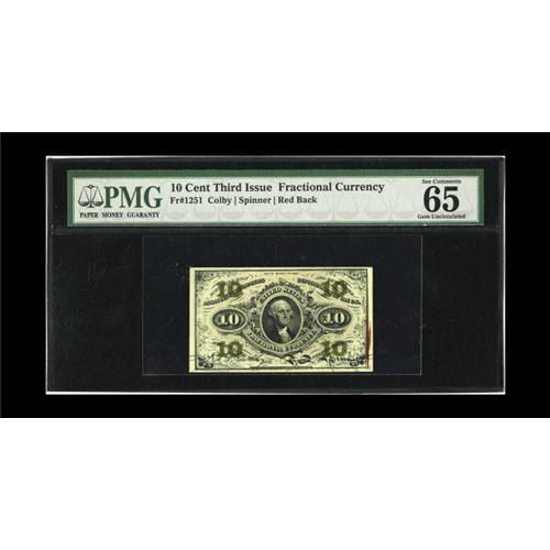<B>Fr. 1251 10c Third Issue PMG Gem Uncirculated 65 EPQ.</B></I> A beautiful note, with bright colors, excellent centering of both sides and no problems save for a very minor press-bed smear.