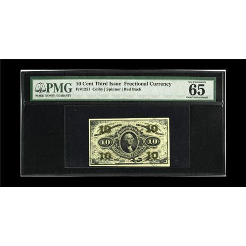 <B>Fr. 1251 10c Third Issue PMG Gem Uncirculated 65 EPQ.</B></I> There is not much that can be improved upon with this beauty. This note is highlighted by generous margins, vibrant color and deep bronzing.