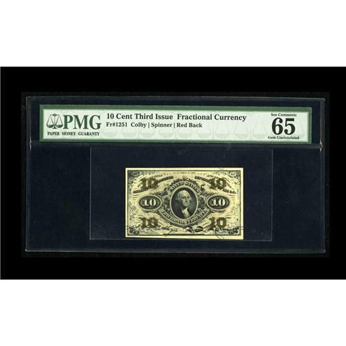<B>Fr. 1251 10c Third Issue PMG Gem Uncirculated 65 EPQ.</B></I> A lovely example of the red back Washington note with superior color and great overall eye appeal.<BR><BR><b>Shipping:</b> Coin/Currency (<a target="_blank" href="http://www.heritageauctions.com/common/shipping.php">view shipping information</a>)