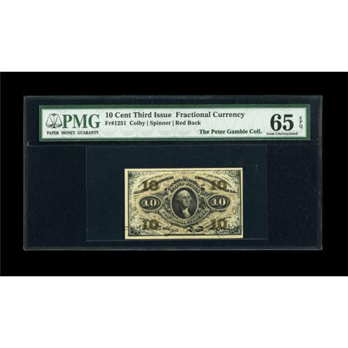 <B>Fr. 1251 10c Third Issue PMG Gem Uncirculated 65 EPQ.</B></I> Ideal centering on the face allows for solid margins on all sides. The bold embossing is clearly noted in the holder.<BR><I>From The Peter Gamble Collection.</B></I><BR><BR><b>Shipping:</b> Coins & Currency (<a target="_blank" href="http://www.heritageauctions.com/common/shipping.php">view shipping information</a>)