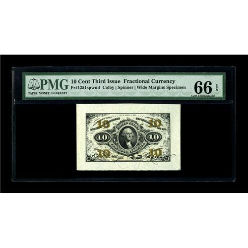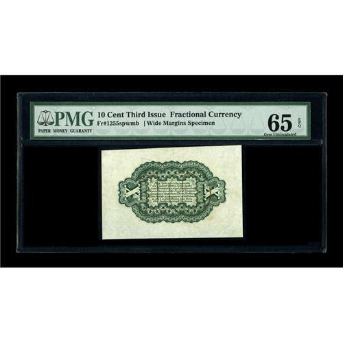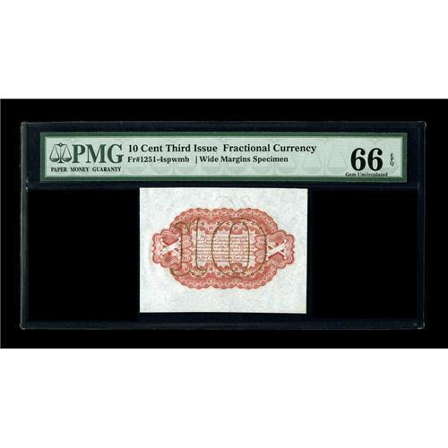 <B>Fr. 1251/55SP 10¢ Third Issue Wide Margin Set of Three PMG Gem Uncirculated 66 EPQ/66 EPQ/65 EPQ.</B></I> All three Wide Margin Specimens have earned the coveted PMG "EPQ" designation. The Face and Red Back have been graded 66, and the Green Back is just a point lower at 65. This lovely Gem trio has terrific eye appeal to go along with the technical accolades assigned by the TPG service. Using "TPG" to mean "third-party grading" leaves this cataloger ill at ease, but as I seem to be the final civilized human still typing out "third-party grading," I have decided to throw in the towel.<BR><BR><b>Shipping:</b> Coins & Currency (<a target="_blank" href="http://www.heritageauctions.com/common/shipping.php">view shipping information</a>)