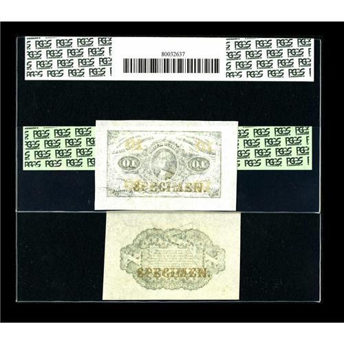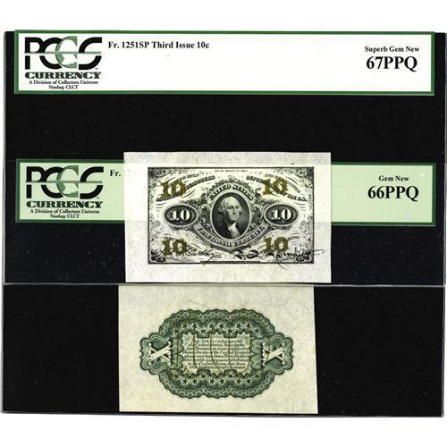 <B>Fr. 1251SP/1255SP 10c Third Issue Medium Margin Face and Back Specimens PMG Superb Gem Unc 67PPQ; 66PPQ.</B></I> The paper is as white as freshly fallen snow on these two. Both pieces are what is generally considered Medium Margin Specimens, with margins far wider than true Narrows.