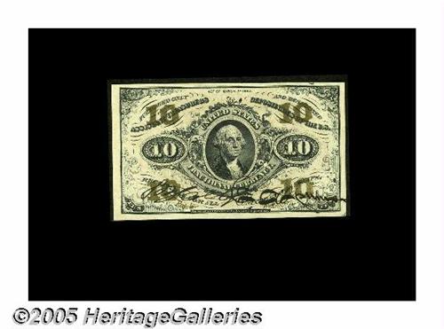 <B>Fr. 1253 10¢ Third Issue Gem New.</B></I> The original embossing on this hand-autographed red back 10 cent is beyond compare and the margins are more than ample.