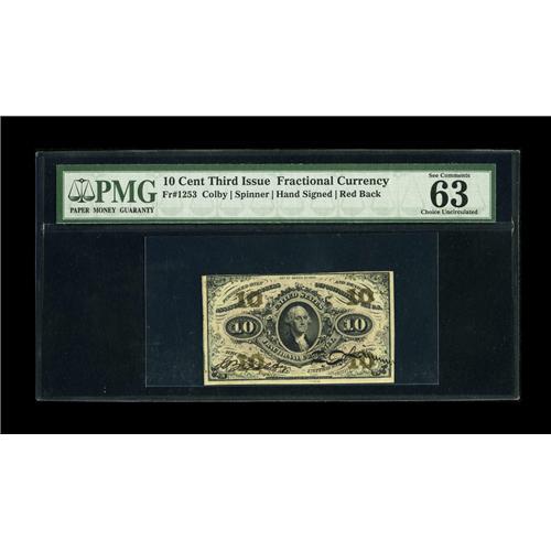 <B>Fr. 1253 10c Third Issue PMG Choice Uncirculated 63 EPQ.</B></I> A touch of tightness is noticed in the top margin on this deeply inked, hand signed example with vibrant red back.<BR><BR><b>Shipping:</b> Coin/Currency (<a target="_blank" href="http://www.heritageauctions.com/common/shipping.php">view shipping information</a>)