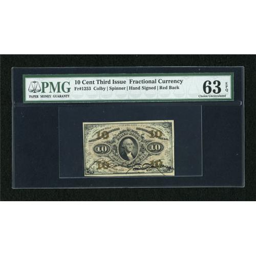 <B>Fr. 1253 10c Third Issue PMG Choice Uncirculated 63 EPQ.</B></I> An original red back Colby-Spinner hand signed note that has bright color and deep embossing. There are a couple of significant wrinkles which appears to be "as made" but there is also a corner tip fold.<BR><BR><b>Shipping:</b> Coins & Currency (<a target="_blank" href="http://www.heritageauctions.com/common/shipping.php">view shipping information</a>)