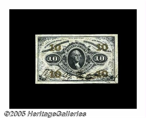 <B>Fr. 1253SP 10¢ Third Issue Narrow Margin Pair Superb Gem New.</B></I> Milton 3S10F.1 and Milton 3S10R.1. Both the hand-signed face and the red back have obviously been cut down from wide-margin pairs. Each has margins that are far broader than normal and both face and back are Superb.