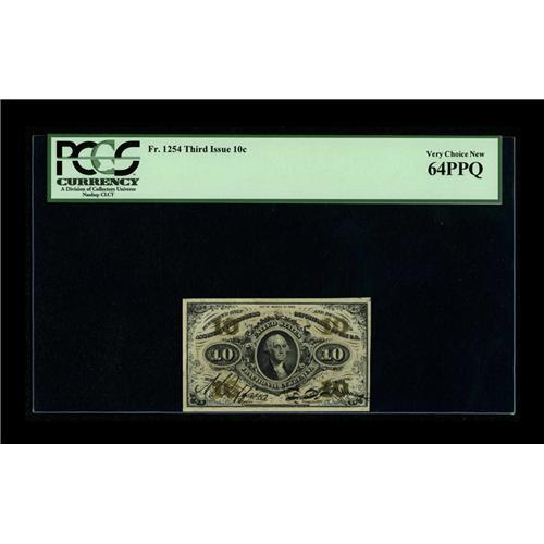 <B>Fr. 1254 10¢ Third Issue PCGS Very Choice New 64PPQ.</B></I> This Jeffries-Spinner hand-autographed 10¢ note is massively rarer than the Colby-Spinner Fr. 1253, yet it rarely brings a premium of more than double. Likely simply a result of having the misfortune of falling on the same line on the Green Sheet. Previously Lot 262 of CAA's January 1996 "Stolen Pie" sale. A sleeper number that in this grade should easily realize...<BR><BR><b>Shipping:</b> Coin/Currency (<a target="_blank" href="http://www.heritageauctions.com/common/shipping.php">view shipping information</a>)
