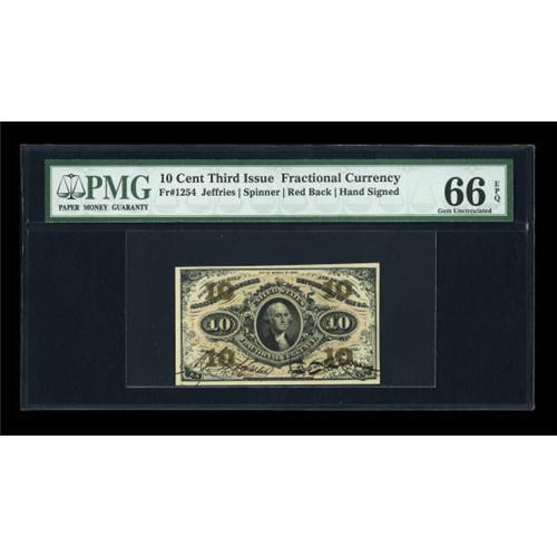 <B>Fr. 1254 10¢ Third Issue PMG Gem Uncirculated 66 EPQ.</B></I> 66 EPQ is an incredibly high grade for this much scarcer Jeffries-Spinner hand-signed Third Issue 10¢ note. In fact, PMG has graded only this note at that level with none higher. It is a very beautiful piece with unusually broad margins, perfect color, and clearly original surfaces. We would not be surprised if this piece remained unique at the grade level for some time into the future.<BR><BR><b>Shipping:</b> Coins & Currency (<a target="_blank" href="http://www.heritageauctions.com/common/shipping.php">view shipping information</a>)