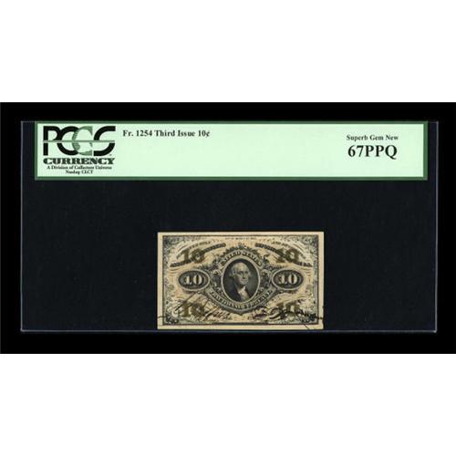 <B>Fr. 1254 10c Third Issue PCGS Superb Gem New 67PPQ.</B></I> This Fr. 1254 stands well alone at the top of the PCGS population report. The next closest note is a 65. These 1254's, with their hand-signed Jeffries-Spinner signature combination, are many times rarer than 1253's. We've handled a number of Gems over the years, but we cannot recall another example with the margin size, colors and overall quality of this piece. An outstanding Fractional note, and a number for which one would not expect to find this quality.<BR><I>From The Thomas M. Flynn Collection</B></I><BR><BR><b>Shipping:</b> Coins & Currency (<a target="_blank" href="http://www.heritageauctions.com/common/shipping.php">view shipping information</a>)