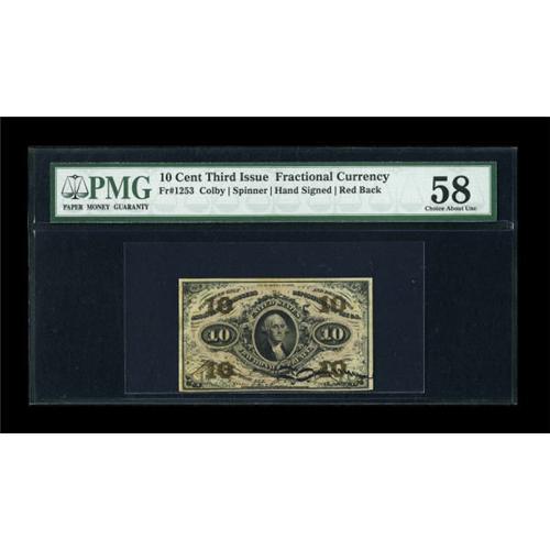 <B>Fr. 1253 10c Third Issue PMG Choice About Unc 58.</B></I> The hand signatures do not bleed through onto the back.<BR><BR><b>Shipping:</b> Coins & Currency (<a target="_blank" href="http://www.heritageauctions.com/common/shipping.php">view shipping information</a>)