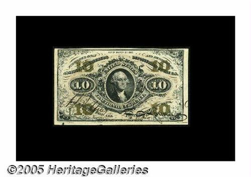 <B>Fr. 1254 Milton 3R10.2 10¢ Third Issue Very Choice New.</B></I> There are a few random offset smears on both sides of this strictly original beauty. If the top margin were just a shade broader, the note would be a perfect Gem. As it is, it's a highly desirable piece, likely in the top ten known. This Jeffries-Spinner signature combination is a true sleeper note.