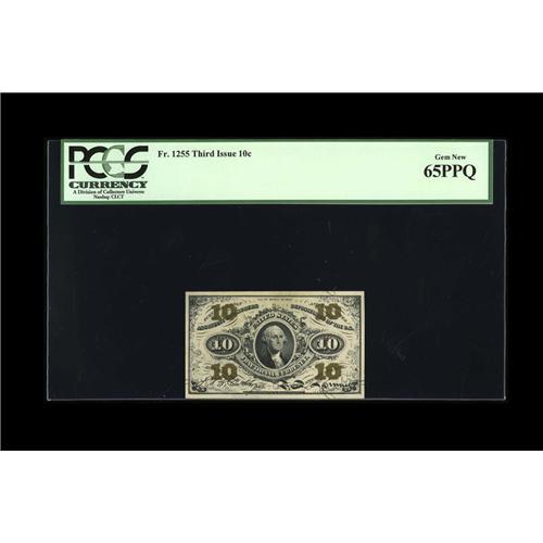 <B>Fr. 1255 10c Third Issue PCGS Gem New 65PPQ.</B></I> The embossing is plainly evident on the back of this bright note with even margins present on the face.