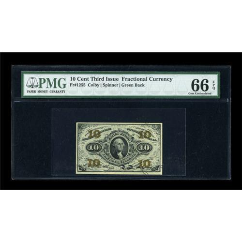 <B>Fr. 1255 10c Third Issue PMG Gem Uncirculated 66 EPQ.</B></I> Solid embossing is noted in the open fields of the back design. The face boasts solid margins for the grade and a well executed design.<BR><BR><b>Shipping:</b> Coins & Currency (<a target="_blank" href="http://www.heritageauctions.com/common/shipping.php">view shipping information</a>)