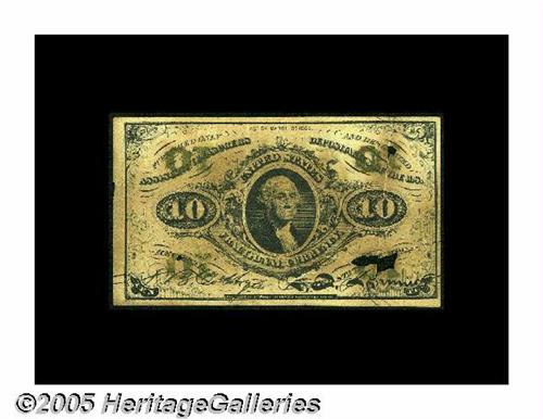 <B>Fr. 1255 Milton 3R10.6e 10¢ Third Issue All Surcharges Inverted Good, Damaged.</B></I> One of only four known examples of this invert and very likely the worst. The note has a number of splits and several holes, including a very sizeable one, and the note is very heavily aged. A good candidate for professional restoration.