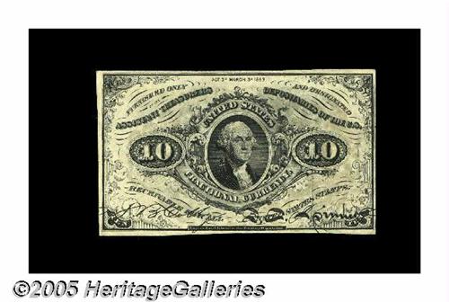 <B>Fr. 1255 Milton 3R10.6g 10¢ Third Issue Extremely Fine.</B></I> From our January 1997 offering of the Milt Friedberg Collection where it was described, "This note is missing its bronze surcharges on both the face and back. At the time the Encyclopedia was published, only a single piece was thought to exist, the presumption being that the Limpert Sale note and the 1958 ANA Sale note were the same piece. It turns out that this piece, which was in the collection of Jackson Storm, was one of those two pieces. It's interesting to note that the back centering on both of the known pieces is unusually low and left, making it an extreme likelihood that they are both survivors from a single sheet. In any event, this incredible piece is one of only two known. It will likely be the centerpiece of any collection of Fractional Errors." <I>Acquired by Tom O'Mara as Lot 845 from CAA's 1/97 Sale. Previously in the collection of Jackson Storm, who acquired the note from this cataloger in June of 1981.</B></I>