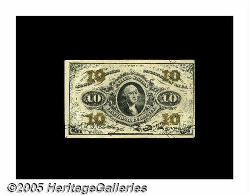 <B>Fr. 1255 Milton 3R10.6m 10¢ Third Issue Inverted Back Engraving Choice New.</B></I> Unique to our best knowledge, until quite recently when a second example in identical condition surfaced. That note can be found in the main catalog of this sale. This was an invert variety that Milt Friedberg was unable to find during his decades of searching. On top of its extreme rarity, the note has terrific grade; with bright bronze, good ink color and all its original embossing remaining. A great invert that will no doubt find itself in the next definitive Fractional collection to be formed.
