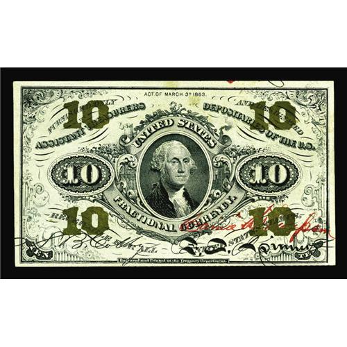 <B>Fr. 1255 Milton 3R10.6n 10¢ Third Issue Courtesy Autograph Choice About New.</B></I> A lovely note with the large, bright red autograph of Carmi Thompson above Spinner's engraved signature. The host note would grade Gem if it were not for a single light vertical fold. This piece realized $275 nine years ago!