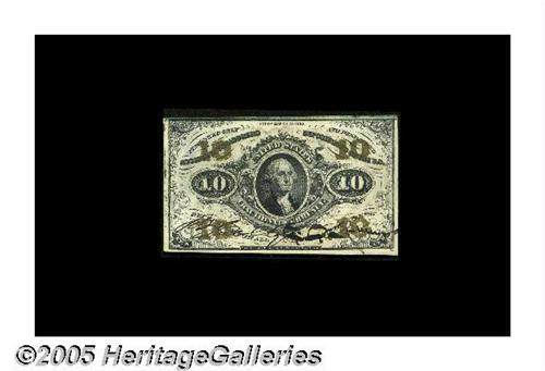 <B>Fr. 1255a Milton 3R10.5 10¢ Third Issue Choice New.</B></I> The finer by far of only two examples known to exist. The other piece was the Milt Friedberg example which we sold in January of 1997 for $39,600. That piece resides in a West Coast collection, and it likely will remain there for many years to come. This note was the Gengerke example, which was sold publicly for the first time in January of 1995 as Lot 121. At that time, it realized $21,450 on an estimate of $20,000-up. The note was acquired by Martin from pioneering paper money dealer Ted Kemm in 1972. Fr. 1255a is the "stopper" note for a complete Regular Issue Fractional Currency set. Only two complete sets can exist, as that is all of the 1255a's that exist. When we sold this note in 1995, it was described, "By far the better of the two pieces known to exist, this lovely note is hand signed by Colby and Spinner. But unlike all other hand-signed notes, it has the back printed in the green ink used for notes with engraved signatures. Although one might expect that at least a full sheet of these had been produced, only this and one other have ever surfaced. This is the only note that F.C.C. Boyd was never able to acquire. It is bright and attractive, with a few ink smears about the margins and one larger smear running the length of the top margin. No Fractional Collection can ever be complete without this variety. The current record price for a piece of Fractional Currency is held by the Fr. 1352 (three known) that was sold by Stack's last year for $126,500. While it is unlikely that this note will pass that record, it is certain to take a run at it."