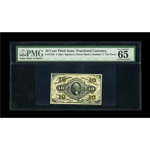 <B>Fr. 1256 10c Third Issue PMG Gem Uncirculated 65 EPQ.</B></I> This is a lovely example of this much scarcer "1" on face variety.<BR><BR><b>Shipping:</b> Coins & Currency (<a target="_blank" href="http://www.heritageauctions.com/common/shipping.php">view shipping information</a>)