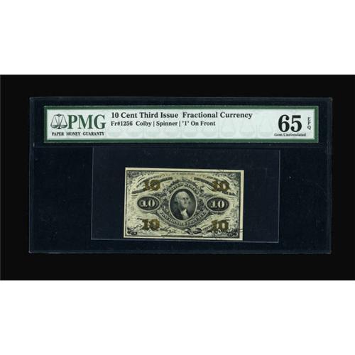 <B>Fr. 1256 10c Third Issue PMG Gem Uncirculated 65 EPQ.</B></I> This is a nicely margined example of the "1" on face variety.<BR><BR><b>Shipping:</b> Coins & Currency (<a target="_blank" href="http://www.heritageauctions.com/common/shipping.php">view shipping information</a>)