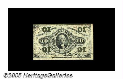 <B>Fr. 1256 Milton 3R10.6f 10¢ Third Issue All Surcharges Inverted Very Fine.</B></I> The four bronze tens on the face as well as the large ten on the back are all inverted. Four examples are known of this Double Inverted note without the design figure "1," but this is the only known example for this Friedberg number. This note was plated, both sides, in the Encyclopedia. It's a decent Very Fine, with a little minor discoloration and a short tear at the upper left edge. It traces its origin back to Harmer Rooke's December 1972 Sale, where it was miscataloged as a Fr. 1255. Tom paid $1,100 for this note at our Friedberg Sale eight years ago.