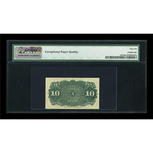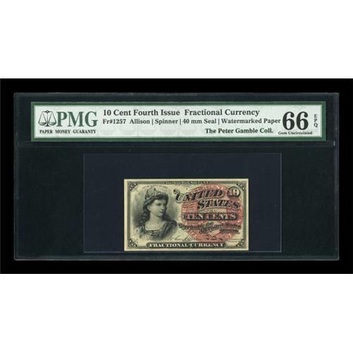 <B>Fr. 1257 10¢ Fourth Issue PMG Gem Uncirculated 66 EPQ.</B></I> Although the watermark is hard to see on this note it is definitively present and attributed correctly by PMG. The note is very nicely margined with beautiful color and clearly original surfaces.<BR><I>From The Peter Gamble Collection.</B></I><BR><BR><b>Shipping:</b> Coins & Currency (<a target="_blank" href="http://www.heritageauctions.com/common/shipping.php">view shipping information</a>)