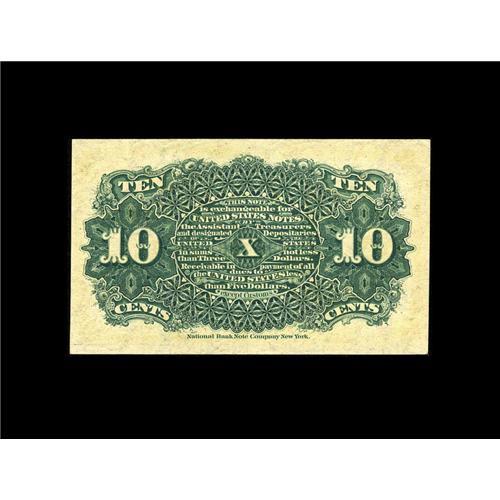 <B>Fr. 1257 10c Fourth Issue Very Choice New.</B></I> This note is from the important Jack Guevrekian Collection that was sold in January 1977 where it was mis-identified. The face of this note has a pink hue as the result of the Treasury Seal plate ink contaminating the sizing compound and spreading a thin layer of pink ink over the surface. Simply eye-catching and beautiful.