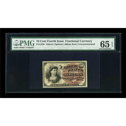 <B>Fr. 1258 10c Fourth Issue PMG Gem Uncirculated 65 EPQ.</B></I> A scarcer number which is distinguished from the far-more-common Fr. 1257 by having been printed on unwatermarked paper. This is a very nice example, having ideal color only being held back by a thin left margin.<BR><BR><b>Shipping:</b> Coins & Currency (<a target="_blank" href="http://www.heritageauctions.com/common/shipping.php">view shipping information</a>)