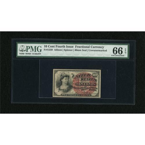 <B>Fr. 1258 10c Fourth Issue PMG Gem Uncirculated 66 EPQ.</B></I> This is a nicely margined note that retains bold color. Well centered with deep inks.<BR><BR><b>Shipping:</b> Coins & Currency (<a target="_blank" href="http://www.heritageauctions.com/common/shipping.php">view shipping information</a>)