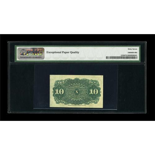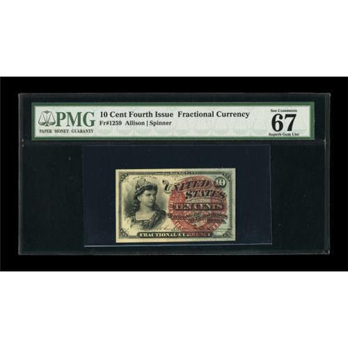 <B>Fr. 1259 10¢ Fourth Issue PMG Superb Gem Unc 67 EPQ.</B></I> PMG has graded only two Fr. 1259's at this 67 EPQ level, and no examples have been graded higher. It's a Superb piece in every sense of the word, with ideal color, huge margins, great centering of both sides and super eye appeal. This is not a rare number at all, but at the 67 EPQ level it becomes a significant grade rarity.<BR><BR><b>Shipping:</b> Coins & Currency (<a target="_blank" href="http://www.heritageauctions.com/common/shipping.php">view shipping information</a>)