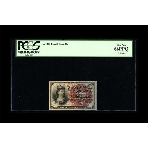 <B>Fr. 1259 10c Fourth Issue PCGS Gem New 66PPQ.</B></I> Wide margins and excellent colors are traits of this note that is formerly of the O'Mara Collection.