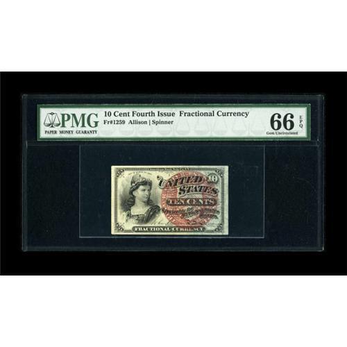 <B>Fr. 1259 10c Fourth Issue PMG Gem Uncirculated 66 EPQ.</B></I> This is a bright representative in a pleasing grade with not many notes graded higher. The deep color enhances the overall eye appeal of the note.<BR><BR><b>Shipping:</b> Coins & Currency (<a target="_blank" href="http://www.heritageauctions.com/common/shipping.php">view shipping information</a>)