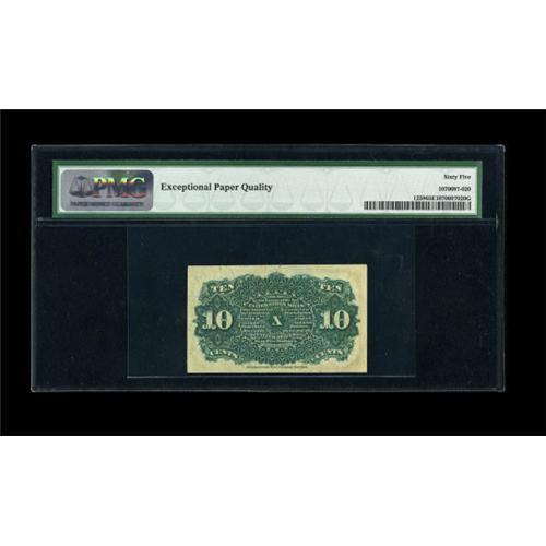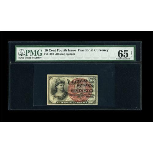 <B>Fr. 1259 10c Fourth Issue PMG Gem Uncirculated 65 EPQ.</B></I> A beautifully bright, well margined example with a bold, large red seal and a heavy scattering of fibers at its right.<BR><BR><b>Shipping:</b> Coins & Currency (<a target="_blank" href="http://www.heritageauctions.com/common/shipping.php">view shipping information</a>)