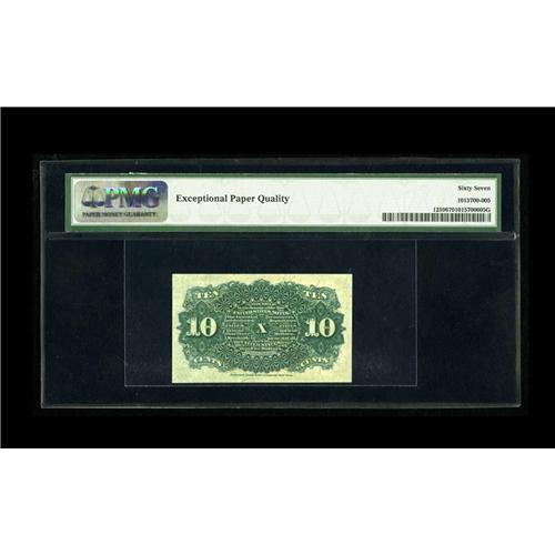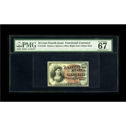 <B>Fr. 1259 10c Fourth Issue PMG Superb Gem Unc 67 EPQ.</B></I> A relatively common note in a decidedly uncommon state of preservation. Vivid blue end paper adds greatly to the overall impact of this lovely note. If you are a collector who wants to acquire only the finest available items for your holdings, you will want to give serious consideration to this Fourth Issue 10¢ example.<BR><BR><b>Shipping:</b> Coin/Currency (<a target="_blank" href="http://www.heritageauctions.com/common/shipping.php">view shipping information</a>)