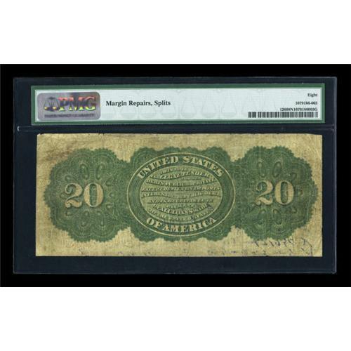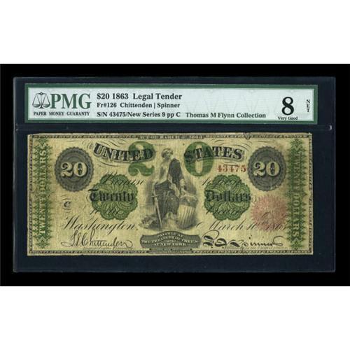 <B>Fr. 126 $20 1863 Legal Tender PMG Very Good 8 NET.</B></I> PMG has noted "Margin Repairs, Splits"--both of which are indeed correct. Only 29 examples are listed in Track & Price, a number which includes Tom's note. Tom acquired this piece for $1760 from our January 1997 FUN sale, where it was also graded VG 8. Auction appearances for this number are rather spread out. Only a single piece sold in 2007, a single piece in 2006, and two notes in 2005. The note has a far better visual appearance than the VG grade would indicated, and the margin repairs are well done and barely visible.<BR><I>From The Thomas M. Flynn Collection</B></I><BR><BR><b>Shipping:</b> Coins & Currency (<a target="_blank" href="http://www.heritageauctions.com/common/shipping.php">view shipping information</a>)