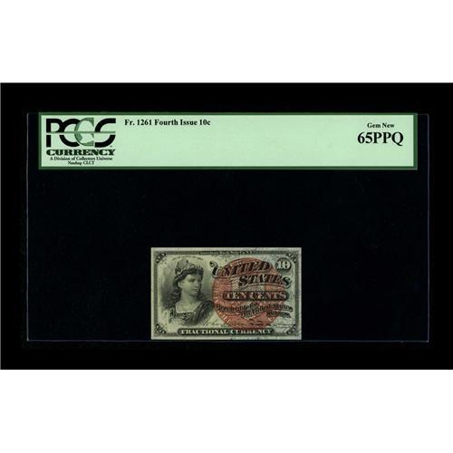 <B>Fr. 1261 10¢ Fourth Issue PCGS Gem New 65PPQ.</B></I> A broadly-margined, brightly colored, simply gorgeous example of this less-often-seen 10¢ Fourth Issue number. Previously Lot 1331 from Stack's September 1993 sale.<BR><BR><b>Shipping:</b> Coin/Currency (<a target="_blank" href="http://www.heritageauctions.com/common/shipping.php">view shipping information</a>)