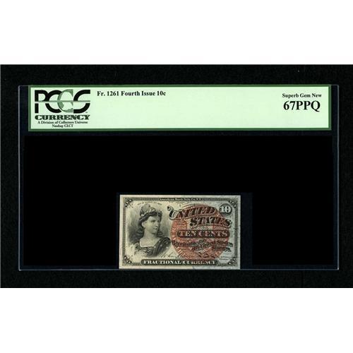 <B>Fr. 1261 10¢ Fourth Issue PCGS Superb Gem New 67PPQ.</B></I> These notes, while thought of as "common" by those of us who have been dealing in Fractionals for decades, are actually quite rare at this grade level. Perfect margins, ideal centering of both sides, and superb eye appeal all must come together for this grade level to be reached. Although hundreds of new examples exist, very few will ever find themselves in 67 or better holders.<BR><I>From The Bill and Kathy Stella Currency Collection</B></I><BR><BR><b>Shipping:</b> Coin/Currency (<a target="_blank" href="http://www.heritageauctions.com/common/shipping.php">view shipping information</a>)