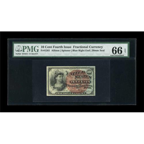 <B>Fr. 1261 10¢ Fourth Issue PMG Gem Uncirculated 66 EPQ.</B></I> PMG has graded none higher than this Fr. 1261. It has beautiful color, good centering of both sides and lots of eye appeal.<BR><BR><b>Shipping:</b> Coins & Currency (<a target="_blank" href="http://www.heritageauctions.com/common/shipping.php">view shipping information</a>)