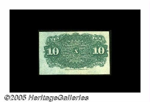 <B>Fr. 1261 Milton 4R10.4a 10¢ Fourth Issue Gem New.</B></I> A lovely example of this final Fourth Issue 10¢ Note. This is the type with the somewhat smaller (38mm) seal and the deep blue anti-counterfeiting stain at the right edge.