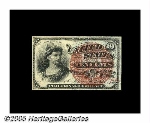 <B>Fr. 1261 Milton 4R10.4b 10¢ Fourth Issue Courtesy Autograph Choice New.</B></I> Carmi Thompson's red signature appears in its usual spot above the engraved signatures. Light pencil notations on the corners of the back indicate that this note was once owned by Maurice Burgett.