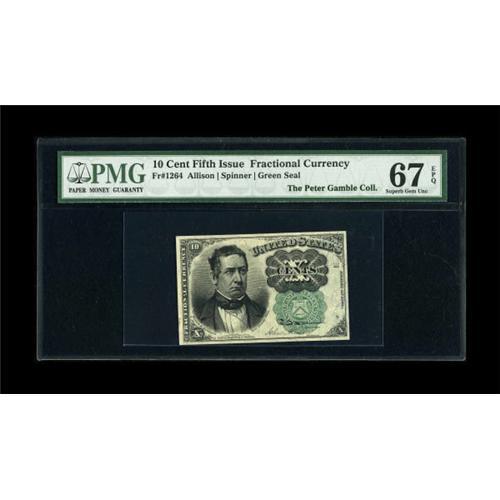 <B>Fr. 1264 10c Fifth Issue PMG Superb Gem Unc 67 EPQ.</B></I> A lovely Green Seal Meredith, well centered and with excellent color. By far the scarcest of the Fifth Issue notes.<BR><I>From The Peter Gamble Collection.</B></I><BR><BR><b>Shipping:</b> Coins & Currency (<a target="_blank" href="http://www.heritageauctions.com/common/shipping.php">view shipping information</a>)