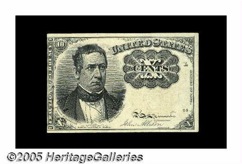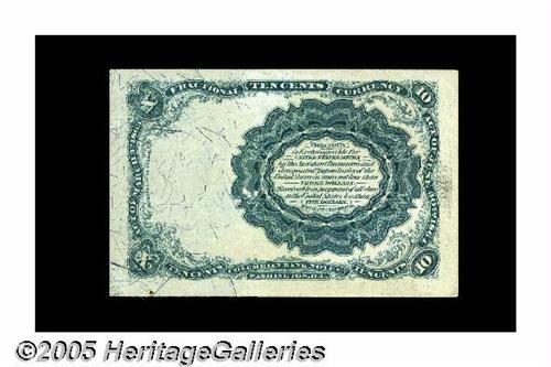 <B>Fr. 1265 Milton 5R10.1c 10¢ Fifth Issue New.</B></I> One of the most convincing no-seal Fractional notes we've seen, as the embossing can be clearly seen with no trace whatsoever of ink. The normal chemical alteration involves wetting the note and the subsequent loss of the embossing effect. Tom vascillated on his opinion of this particular example, as do we, but if a real Error of this type exists, this one is (probably) it.