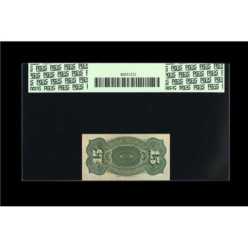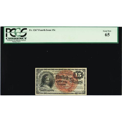 <B>Fr. 1267 15c Fourth Issue PCGS Gem New 65.</B></I> The back centering is excellent and the margins sizeable on this crisp, vivid note.