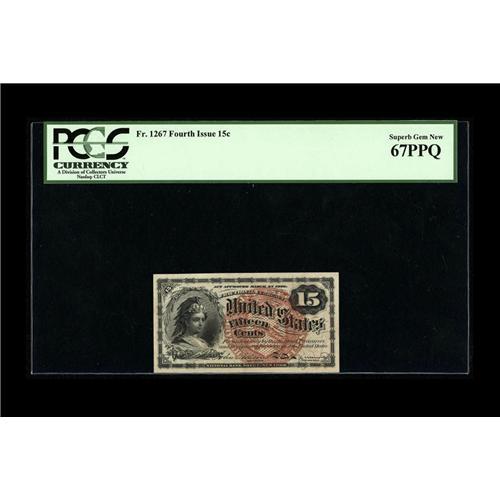 <B>Fr. 1267 15c Fourth Issue PCGS Superb Gem New 67PPQ.</B></I> Simply a stunning example with broad, even margins on both sides of the note.