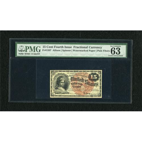 <B>Fr. 1267 15c Fourth Issue PMG Choice Uncirculated 63 EPQ.</B></I> A heavily watermarked example of this popular one denomination type.<BR><BR><b>Shipping:</b> Coins & Currency (<a target="_blank" href="http://www.heritageauctions.com/common/shipping.php">view shipping information</a>)