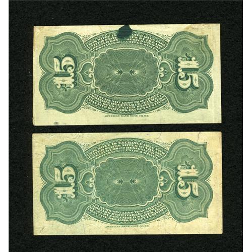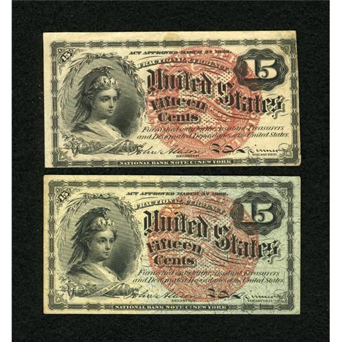 <B>Fr. 1267 15c Fourth Issue VF, once mounted<BR>Fr. 1271 15c Fourth Issue XF.</B></I><BR> A green spot is noticed on the back of the first note.<BR><BR><BR><b>Shipping:</b> Coins & Currency (<a target="_blank" href="http://www.heritageauctions.com/common/shipping.php">view shipping information</a>)